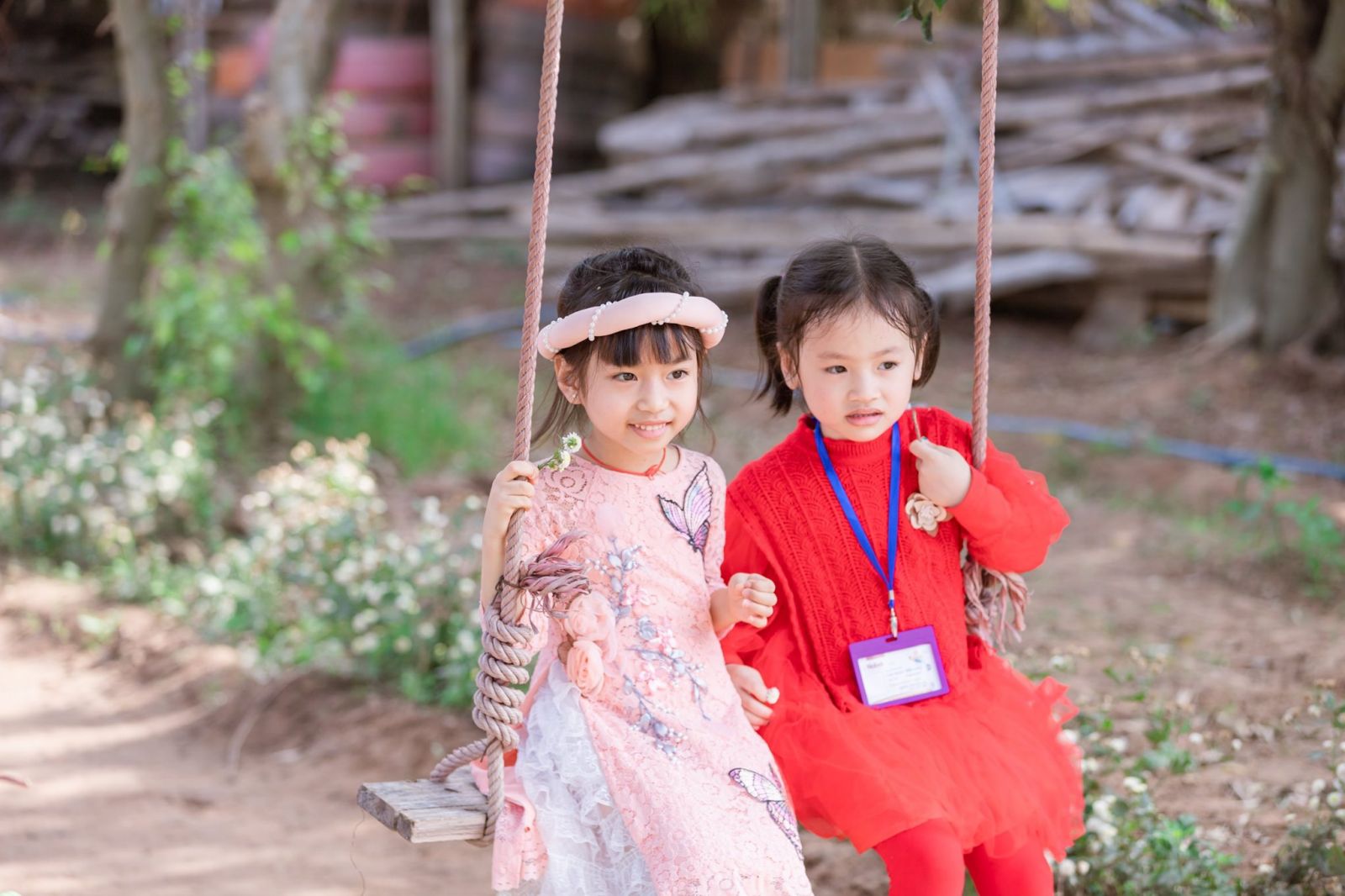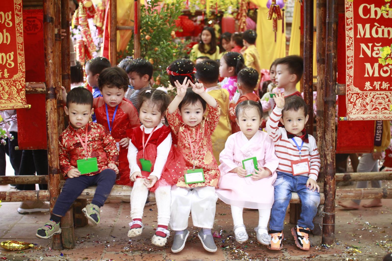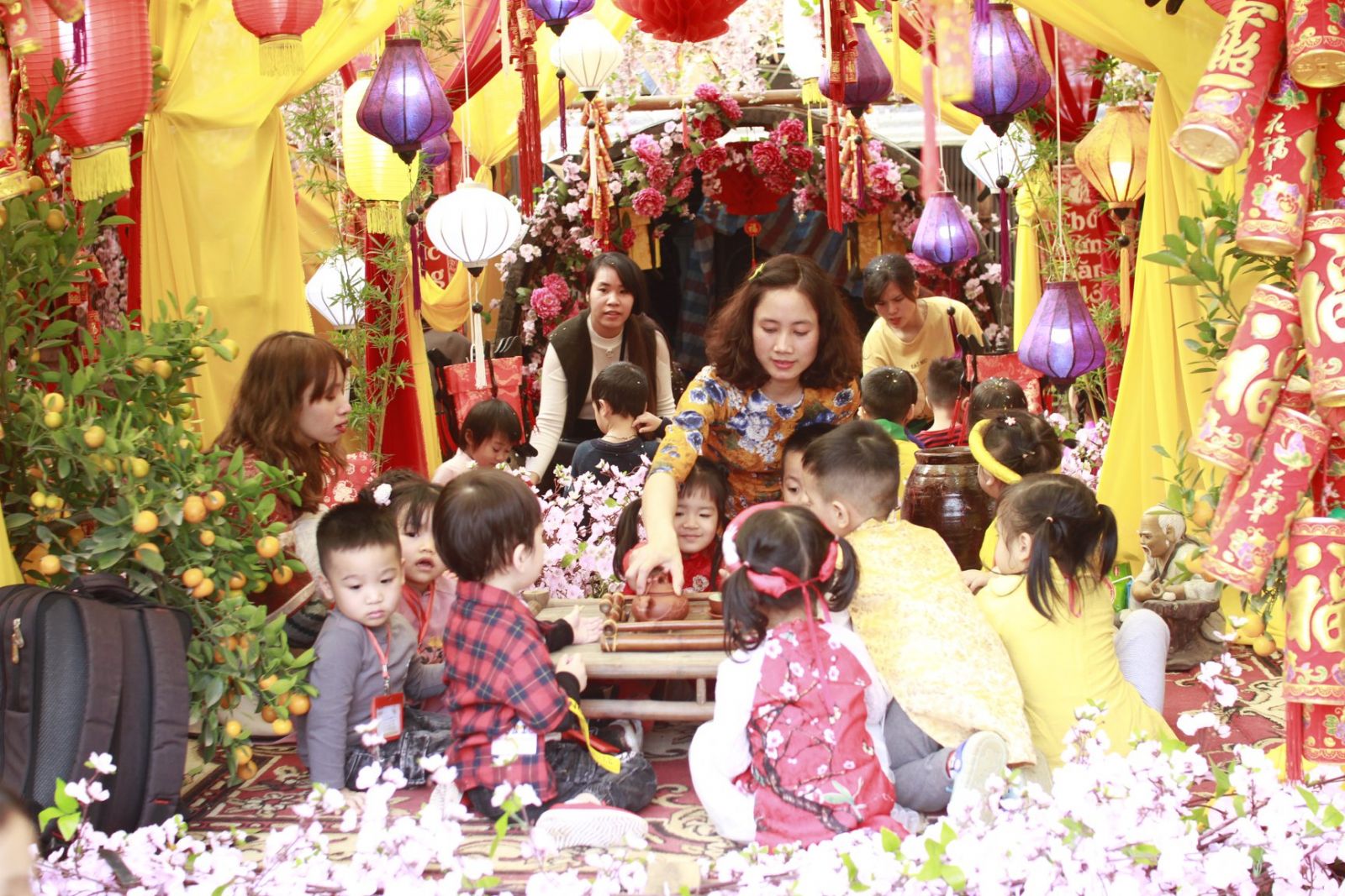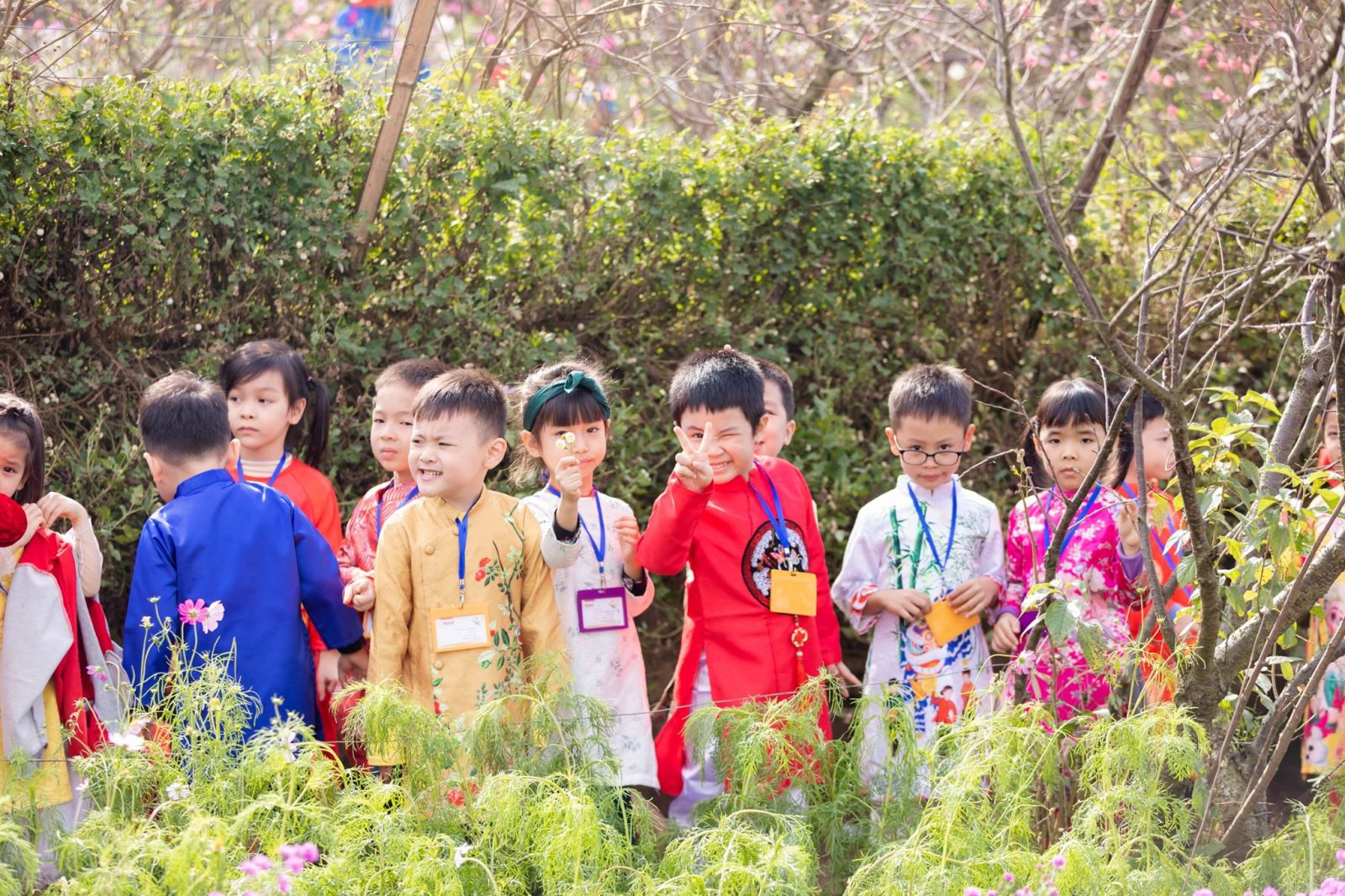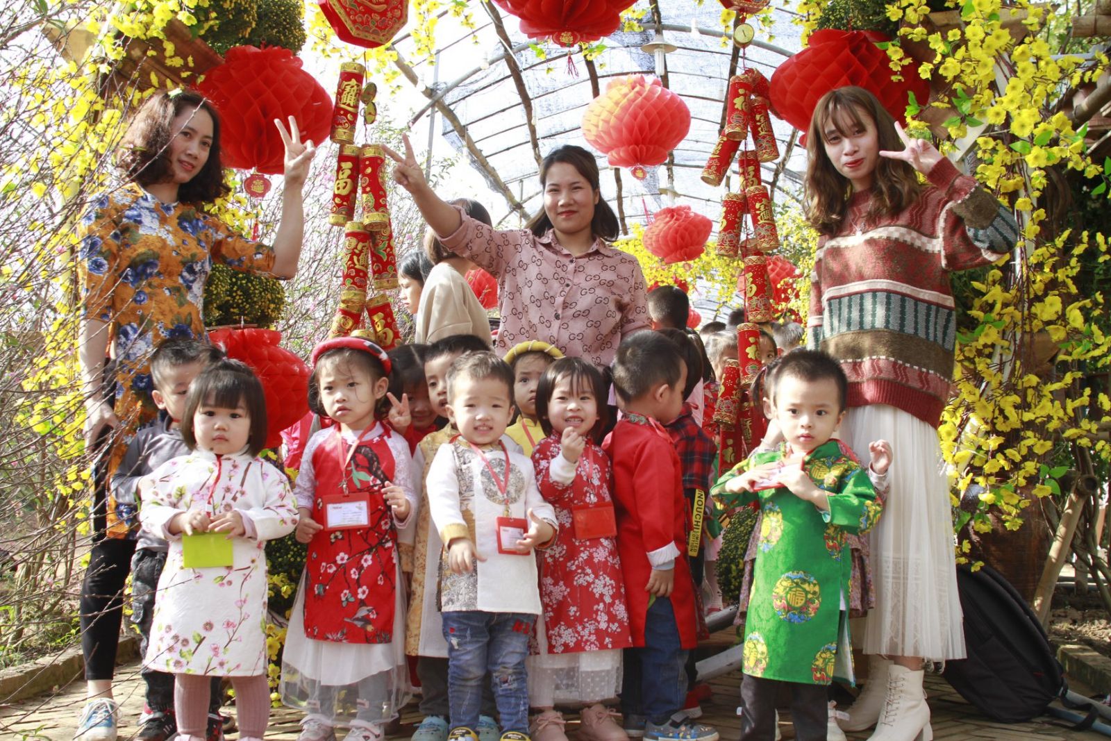 Ở vườn hoa có rất nhiều loại hoa mùa xuân, này là hoa Đào, hoa Mai, hoa Bươm Bướm, hoa Cúc... Các bạn nhỏ của chúng ta vô cùng thích thú, nhìn ngắm và hít thở không gian tràn ngập hương hoa